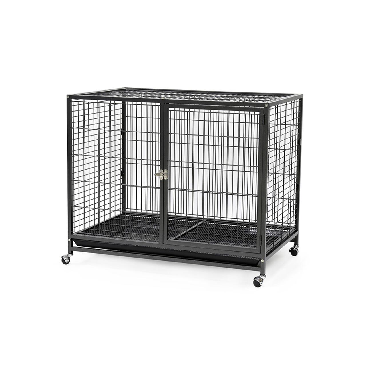 Cușca este perfectă pentru câinii de talie medie și mare. Aceasta dispune de o ușă dublă de blocare, pentru a asigura animalele de companie în condiții de siguranță.