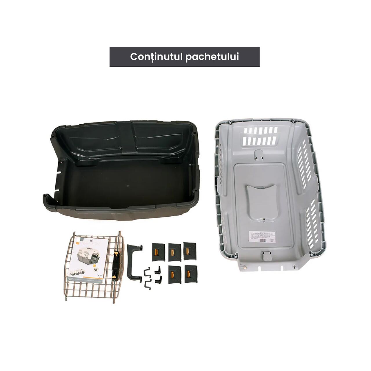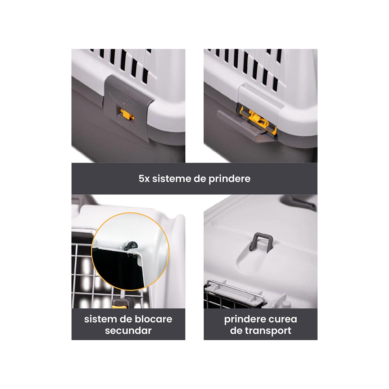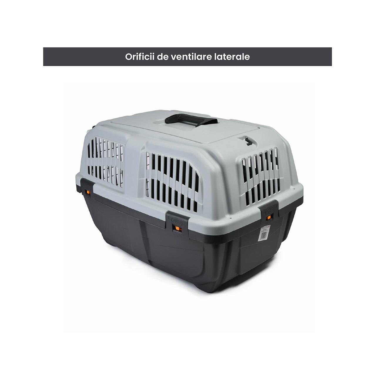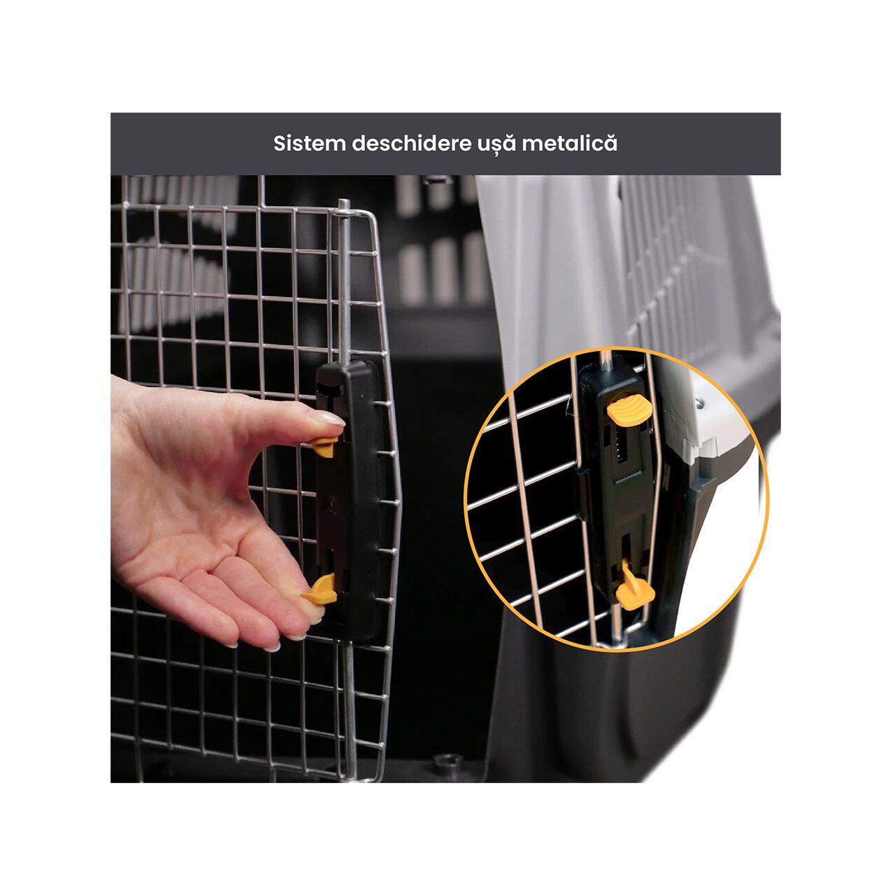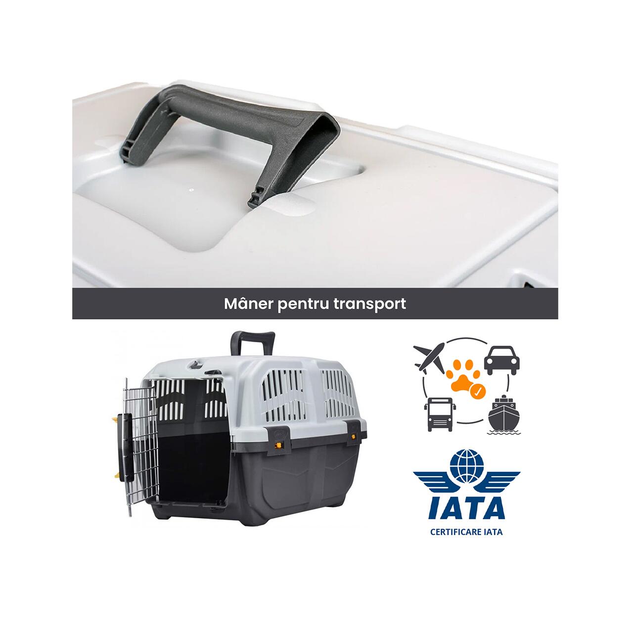 Construită în conformitate cu normele IATA, este potrivită pentru transport aerian, dar și pentru călătorii auto sau feroviare, asigurând animalului confort și protecție pe tot parcursul drumului.