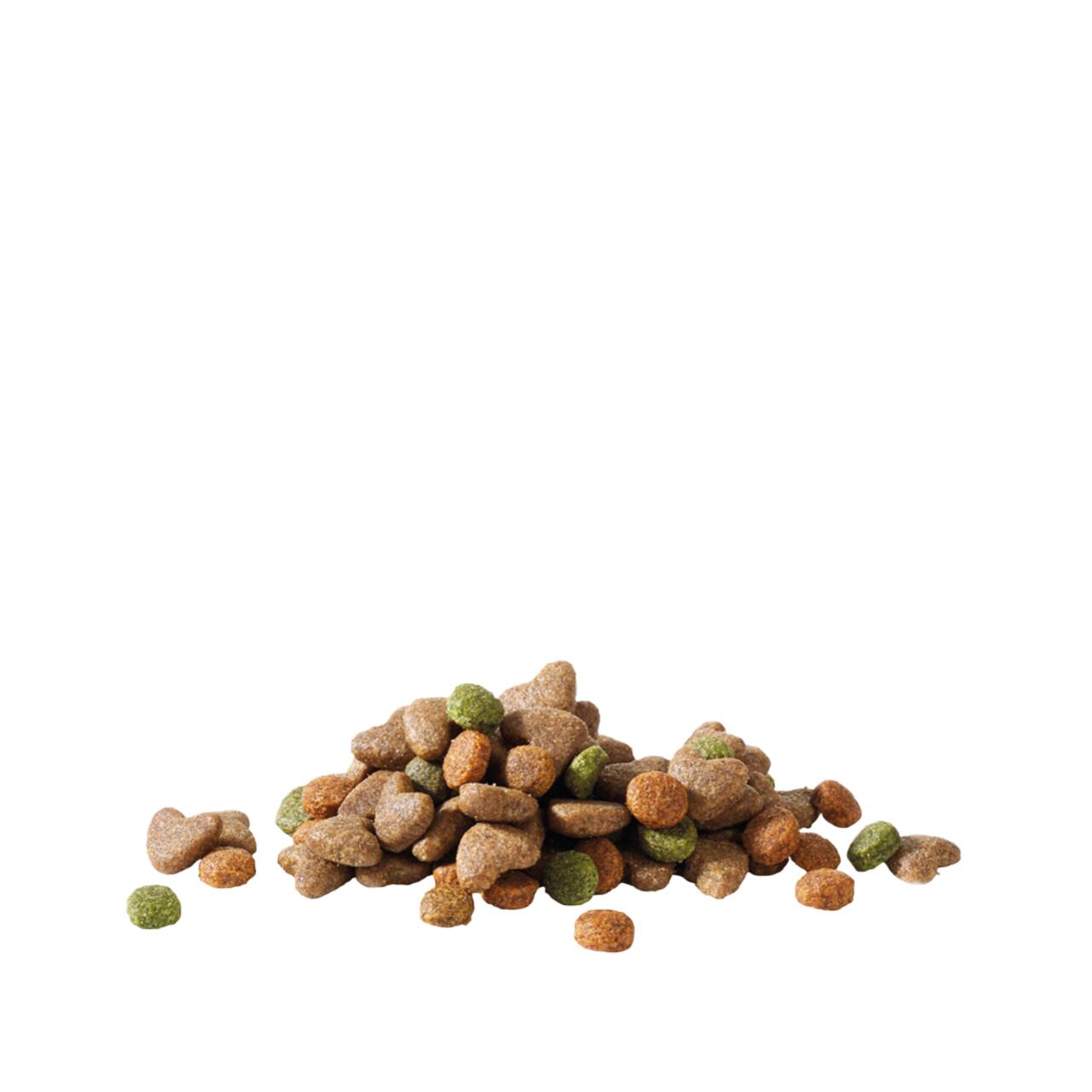 carne și derivate de origine animală (pui 20%), cereale (orez 10%), derivate de origine vegetală, uleiuri și grăsimi, legume (morcovi 0.5% și broccoli 0.5%), semințe, drojdii, minerale, fructe (mere 0.5%).