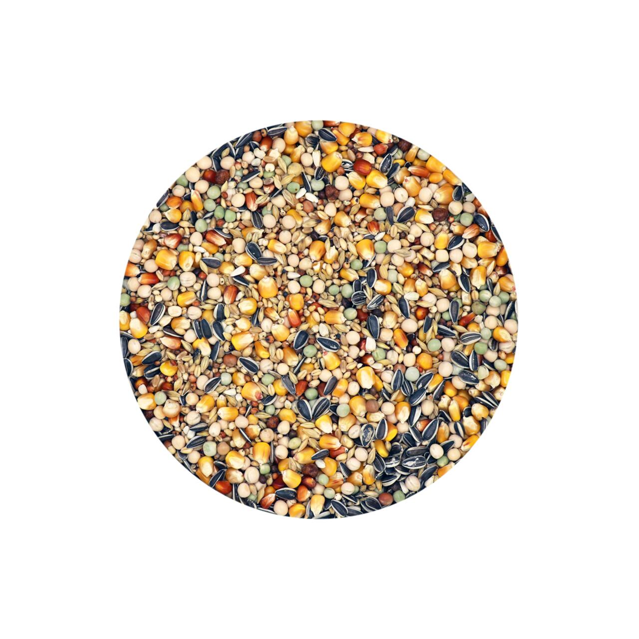 porumb roșu 10%, porumb premium cribs 10%, mazăre de arțar 2%, mazăre 4%, mazăre galbenă 8%, mazăre verde mare 8%, neghină 3%, grâu porumbel alb 18%, dari galben 7%, dari roșu 10%, șofran 2%, orz de porumbei 8%, orez negru 2%, semințe de floarea soarelui cu dungi mici 2%, mei galben 2%, semințe de in maro 2%, semințe de col negru 2%.