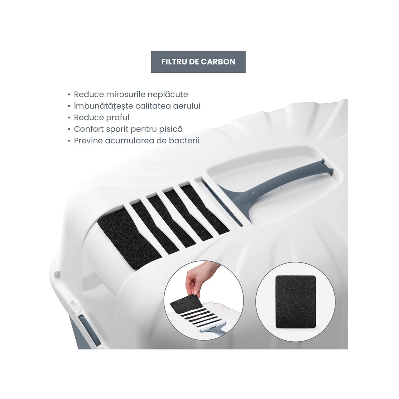 Uşiţa din material plastic previne răspândirea nisipului prin casă, animăluţul are mai multă intimitate şi se simte mai în siguranţă, iar mirosurile neplăcute sunt ţinute în interior. Filtrul de carbon activ fixat în locul special creat în capacul litierei va opri răspândirea mirosului neplăcut prin casă. Litiera este prevăzută de asemenea și cu lopețică pentru curățarea așternutului absorbant.