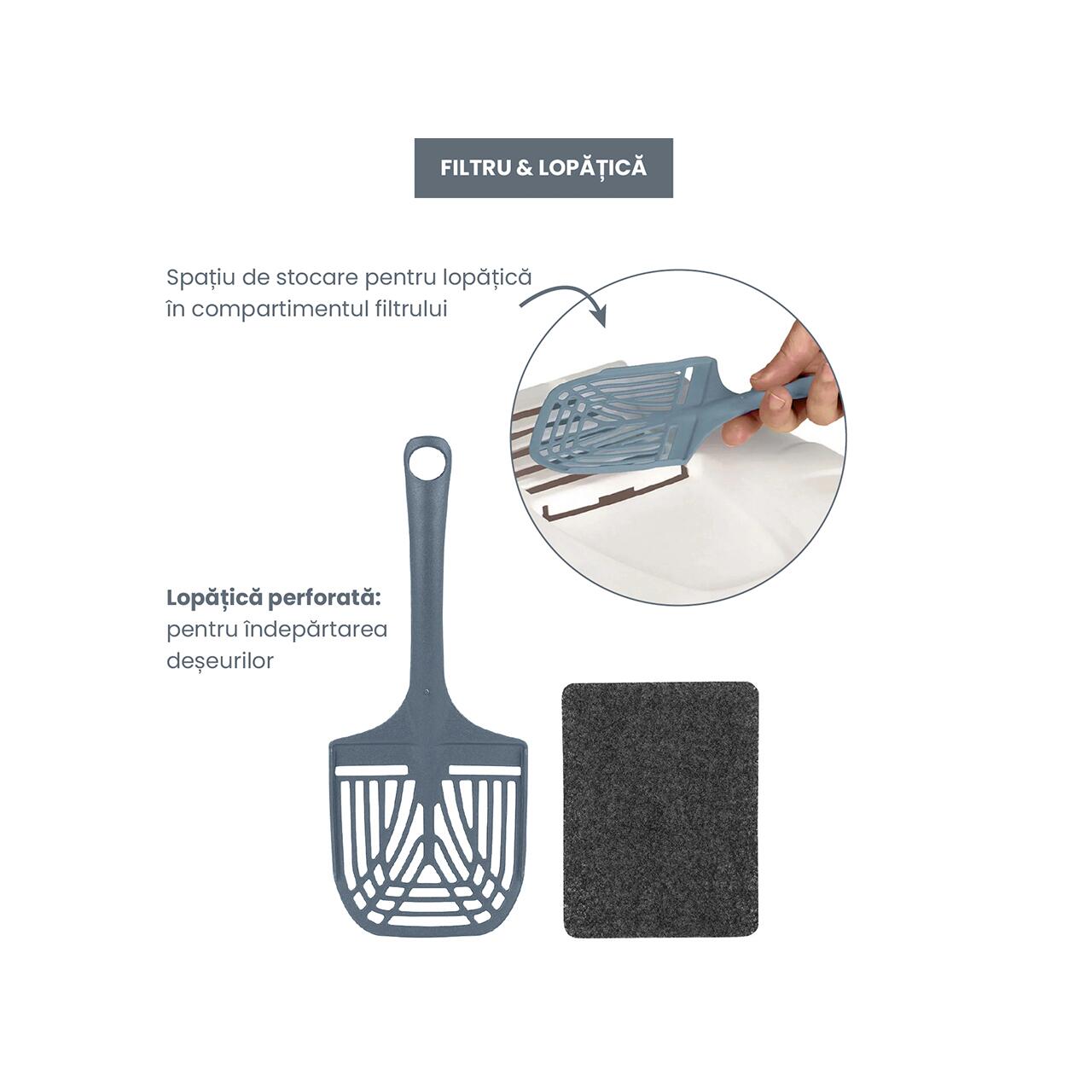 Astfel, spatele toaletei este realizat prin raportare la dimensiunea unei pisici ajunsă la maturitate. Este prevăzută cu mâner ergonomic şi pliabil. Capacul, cu mânerul integrat, este fixat de baza toaletei prin intermediul unor îmbinări la presiune, o combinaţie perfectă între securitate şi uşurinţă în utilizare. Datorită îndepărtării complete a capacului, baza toaletei poate fi uşor de curăţat.