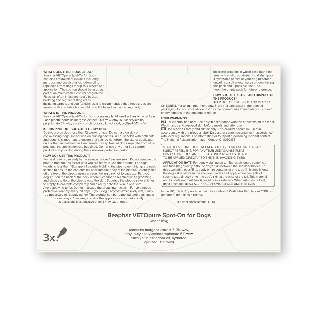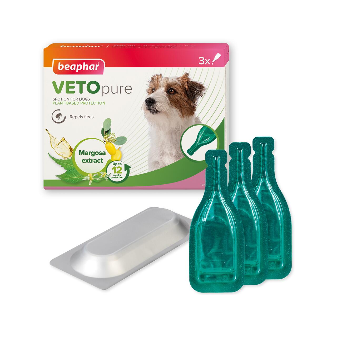 Beaphar VETOpure Spot-On pentru câini conține extracte naturale din plante, inclusiv margosa și ulei de eucalipt citriodora, pentru a respinge puricii de pe câini timp de până la 4 săptămâni per aplicare. Spot-on-ul trebuie utilizat ca parte a unui program eficient de combatere a puricilor.