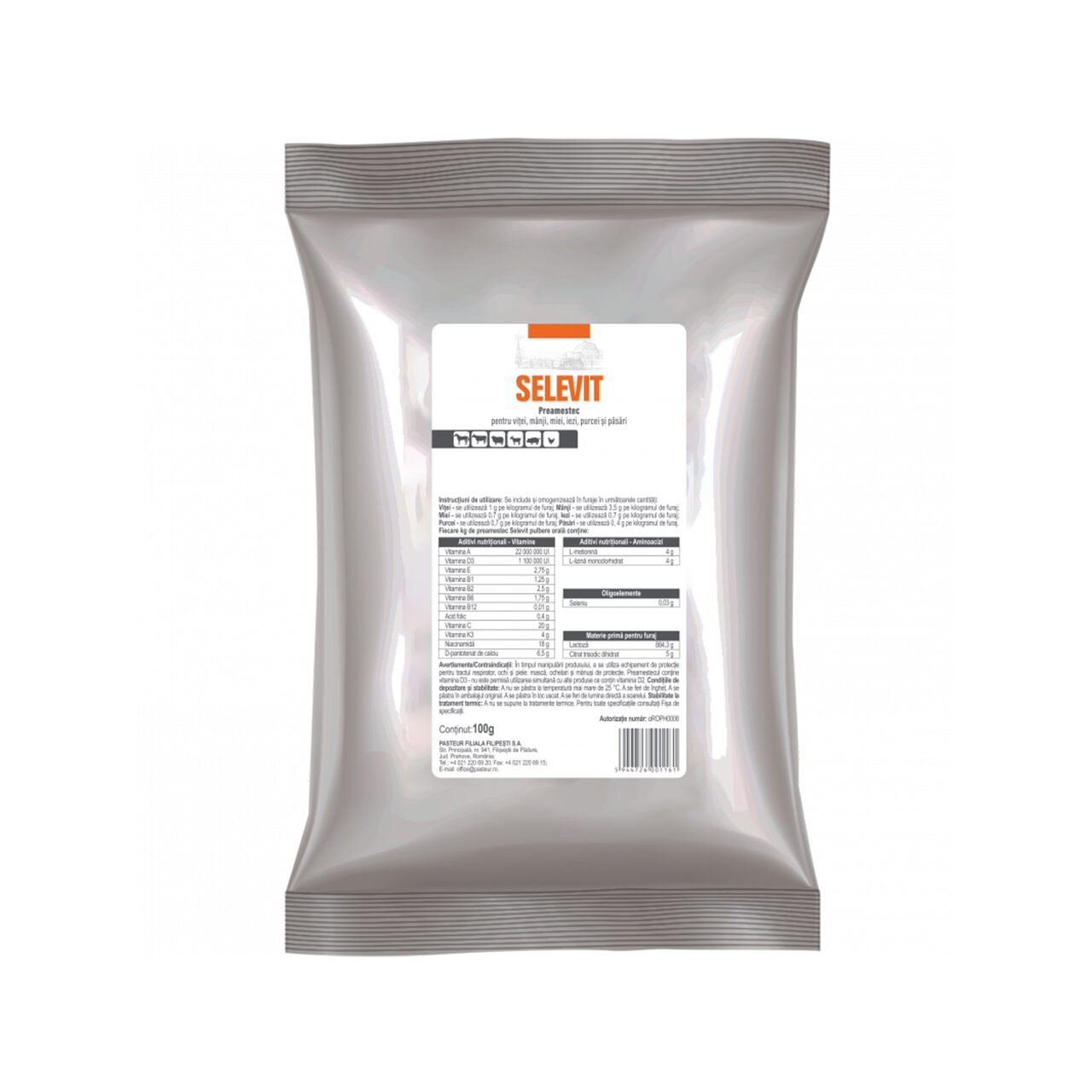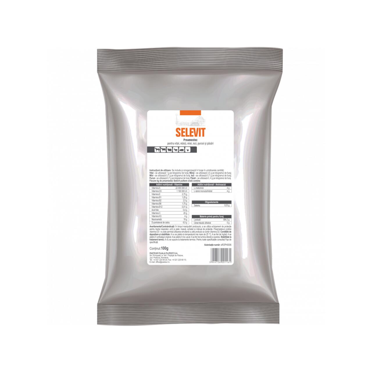 SELEVIT este o combinație de vitamine, aminoacizi esențiali și seleniu, intervenind activ în procesele de metabolism și de sinteză proteică. Este indicat în unitățile de exploatare intensivă, pentru producția animalieră unde disvitaminozele și dismetaboliile sunt foarte frecvente și se manifestă prin scăderea apetitului, pierdere în greutate, conversia deficitară a furajului, dermatite, modificări ale părului sau penelor, distrofii musculare. Prin compoziția sa produsul crește digestibilitatea proteinei. Adaosul de seleniu previne tulburările metabolice specifice și crește rezistența la boli. Produsul se utilizează ca adjuvant în stări carențiale în vitamine, aminoacizi și seleniu, în stări de convalescență, pentru stimularea sistemului imun și a performanțelor zootehnice la viței, mânji, miei, iezi, purcei și păsări.