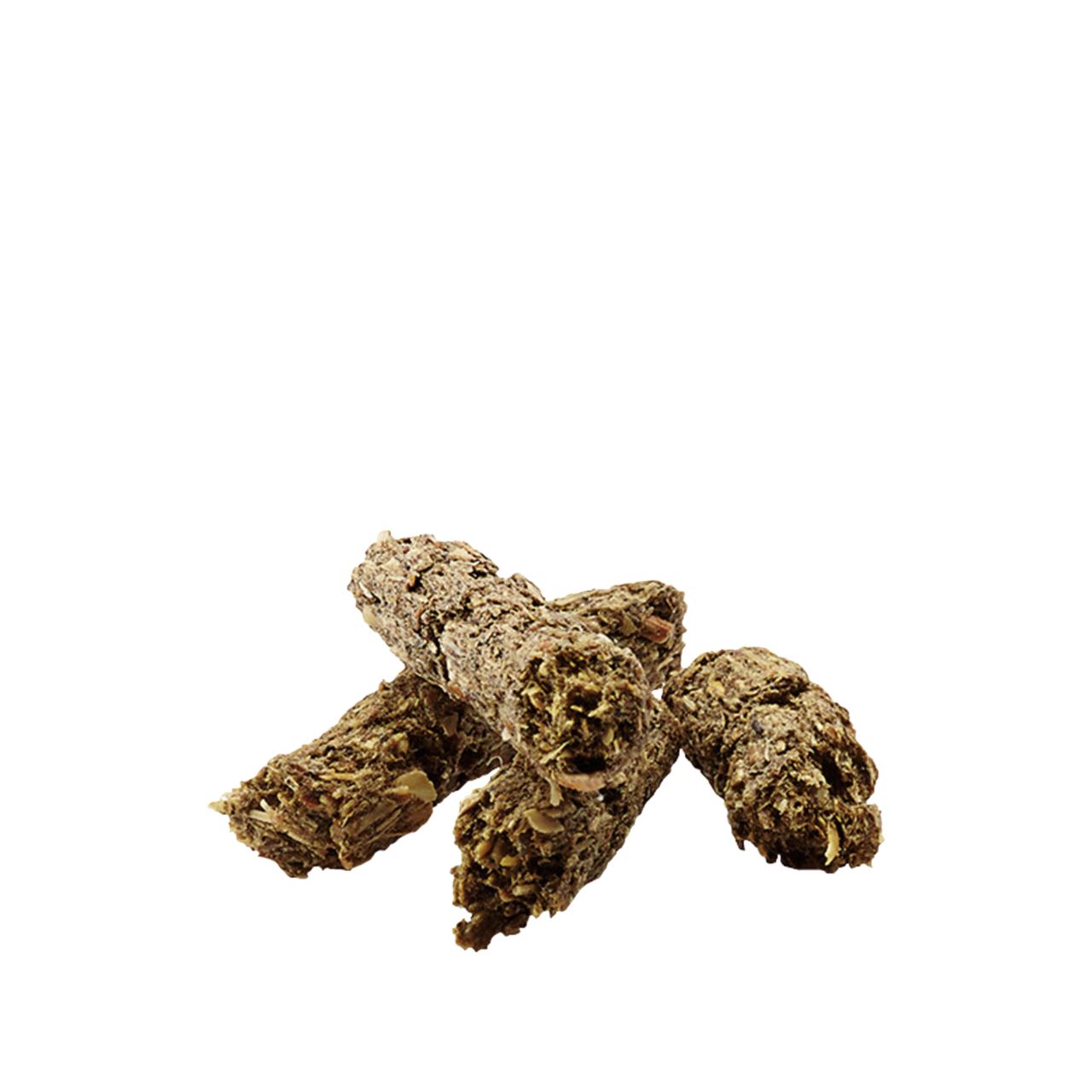 Fărăr zahăr adăugat, cu semințe de in (sursă de Omega 3) ideale pentru o blană sănătoasă, cu fibre lungi (fân și lucernă) – pentru o bună digestie și pentru dinți sănătoși.