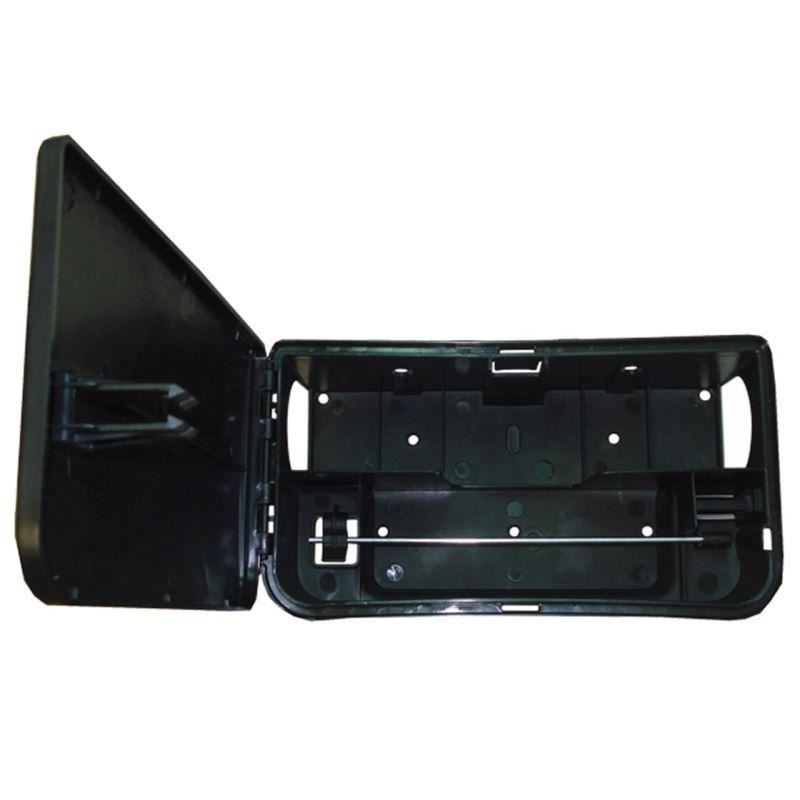 Culoare neagra, din plastic, cu sistem exclusiv de siguranta, prevazuta cu cheie universala de plastic.
