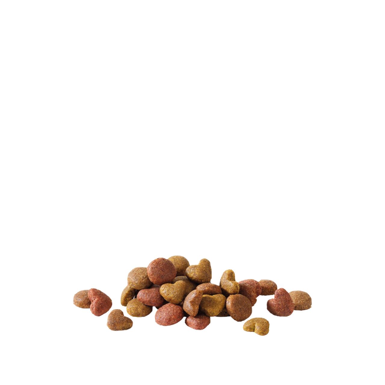 cereale, carne și derivate de origine animală (pui 12%), derivate de origine vegetală, pește și derivate din pește (somon 6%), uleiuri și grăsimi (ulei de somon 1%), legume (mazăre 2%, morcovi 0.5%, roșii 0.5%, broccoli 0.5%), semințe, minerale, drojdii, fructe (mere 0.5%).